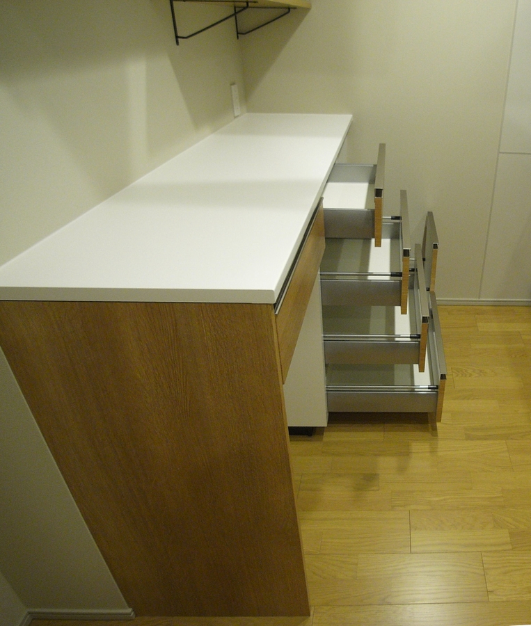 | 仕上げ材 | 吊戸棚扉・引き出し前板・サイドパネル:オレフィンシート、下台天板・飾り棚:メラミンカウンター、アルミレール引手、 |