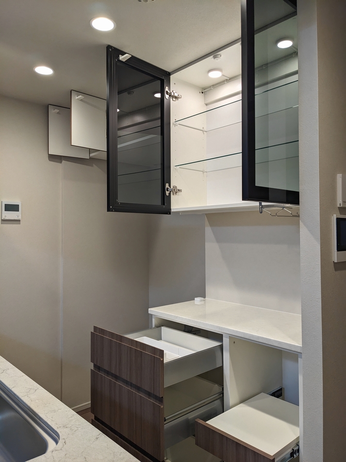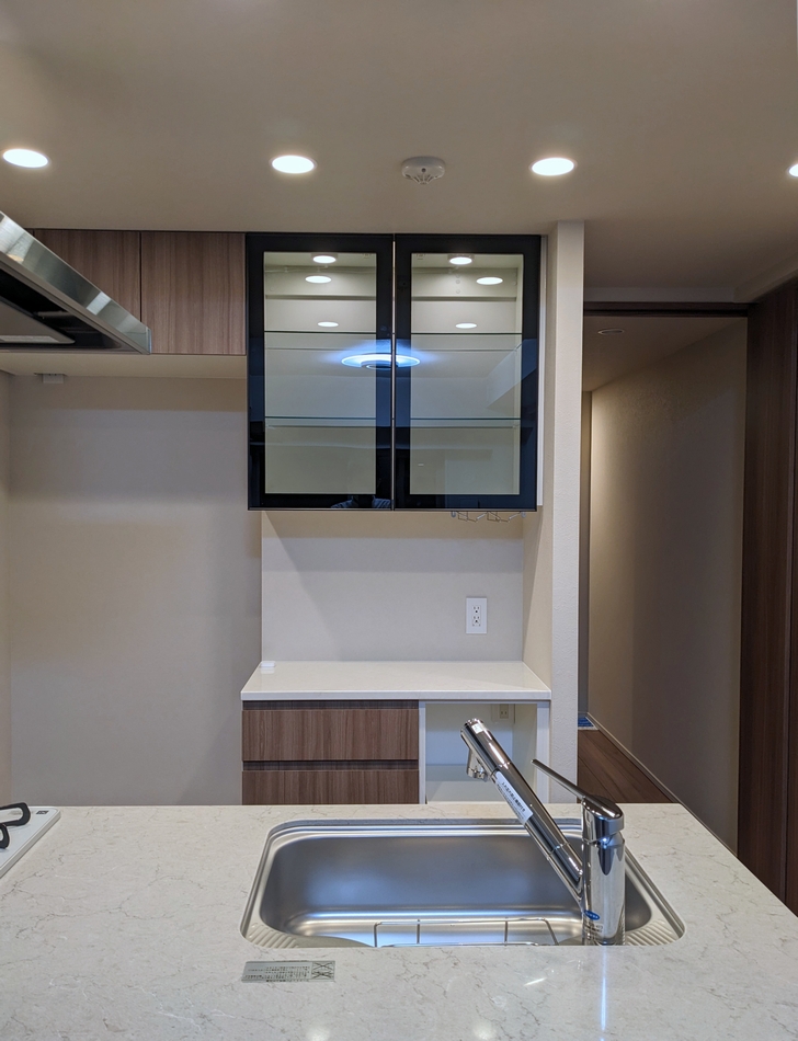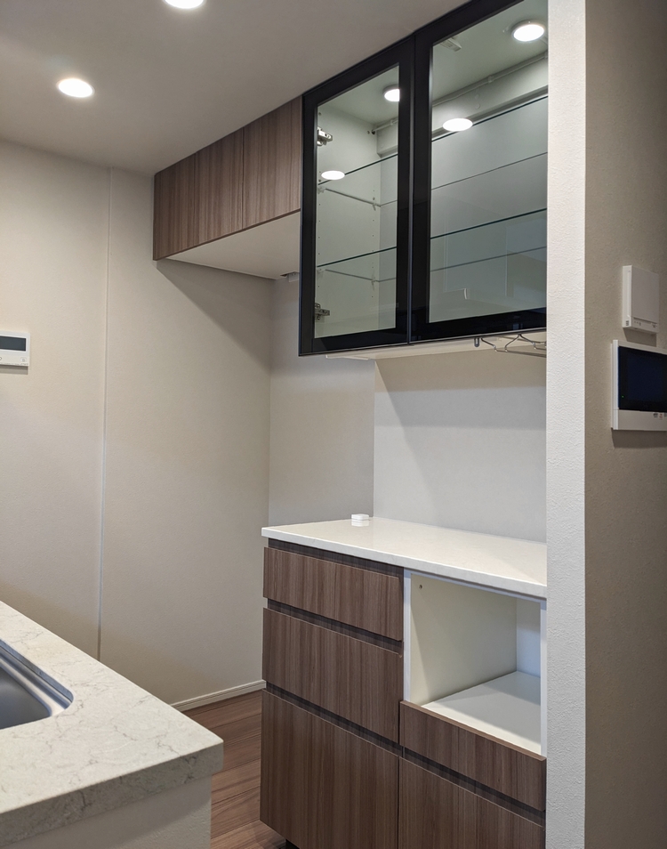 カップボードの位置は、リビングからも見える場所。 扉にガラス棚を使うことで、照明の光がやわらかく広がり、空間がより明るく感じられます。 家具のように見せつつ、下台カウンターでは収納力もしっかり確保しました。