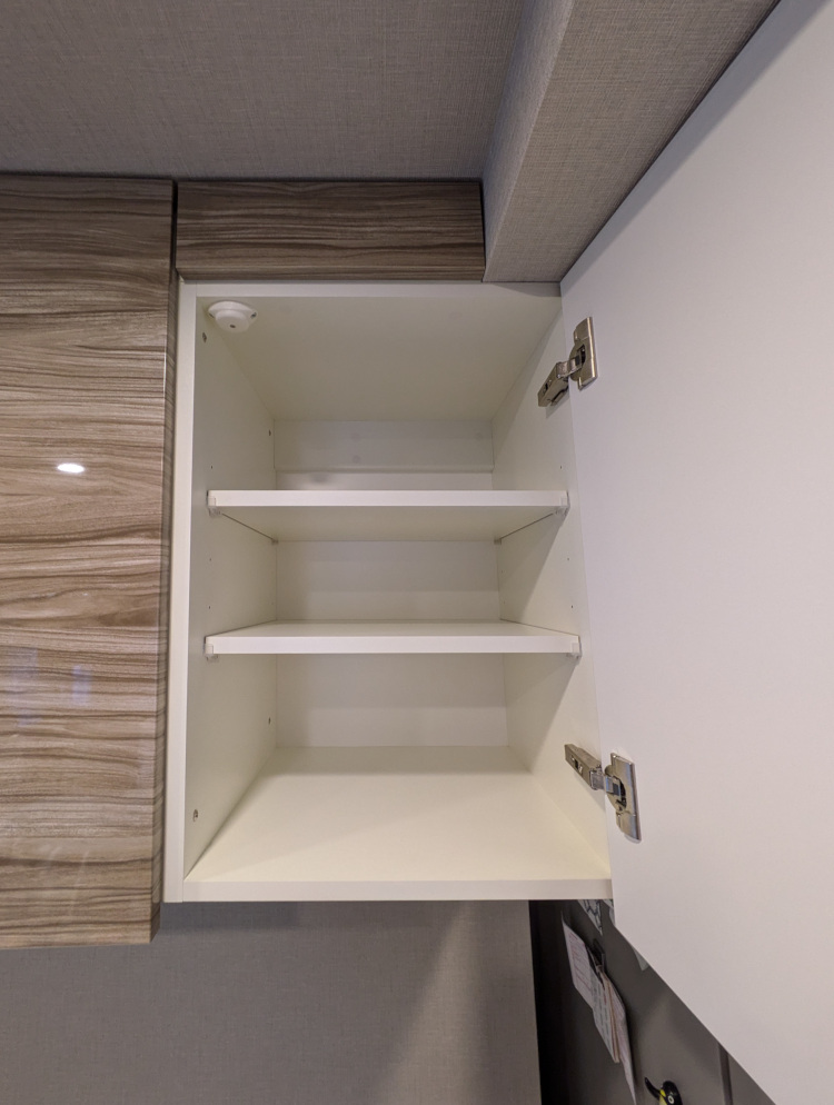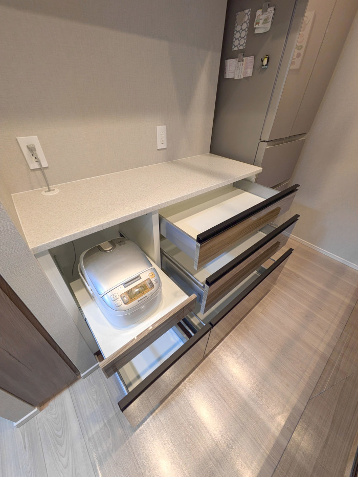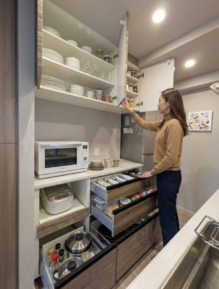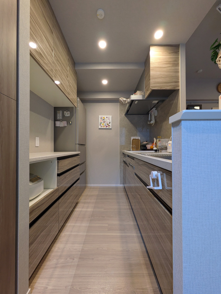 分譲マンションの備え付けキッチンと同じ「鏡面木目柄」の扉材で仕上げたオーダーカップボード。 既製品では難しい「124cm」という中途半端な壁幅にも、1mm単位のサイズオーダーでぴったりと収めています。