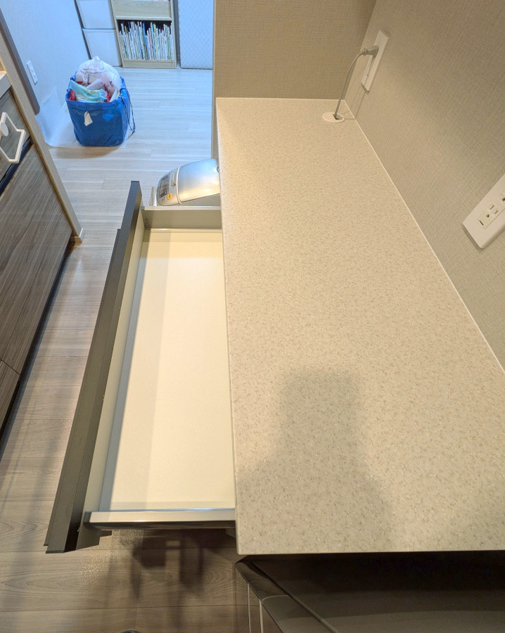 扉:メラミン扉(レール引手・ブラック) 天板:メラミン 標準仕様:扉・引き出しソフトクローズ付、引き出しフルオープン |