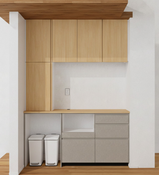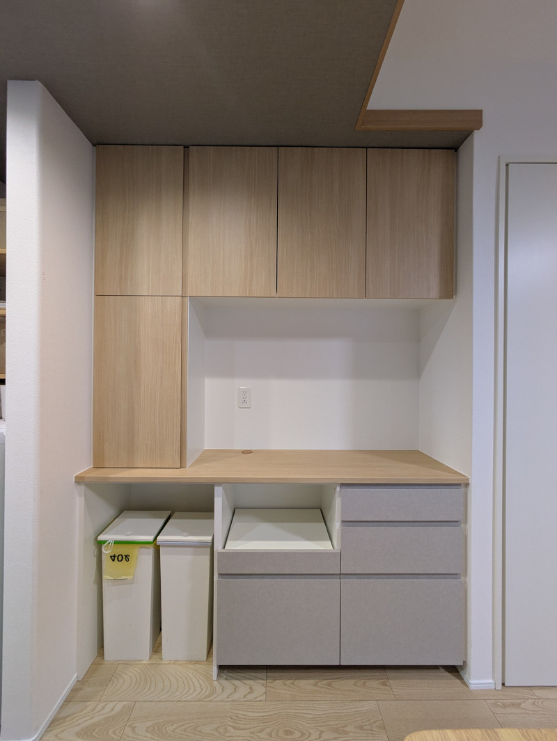 収納の構成はゴミ箱スペース、家電スライド、引き出し収納を組み合わせています。左側はカウンターから天井までのトールタイプの収納を配置しました。