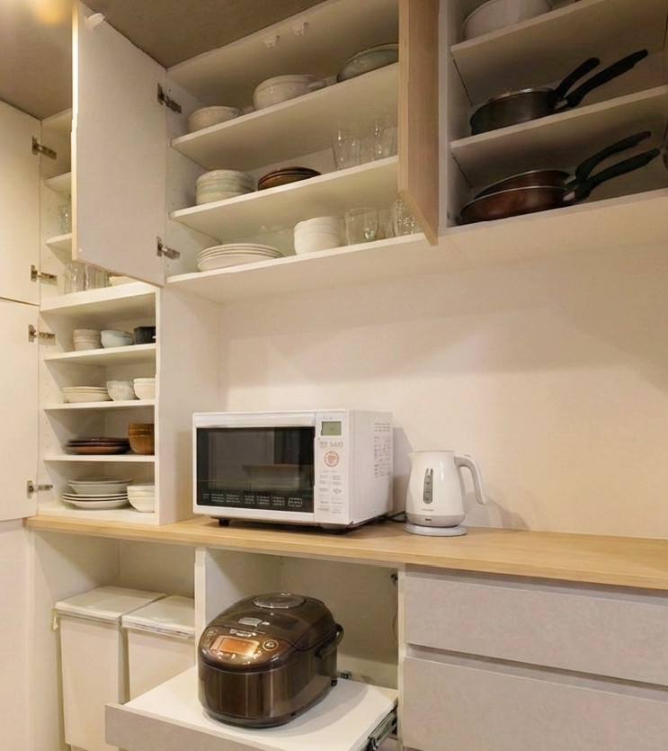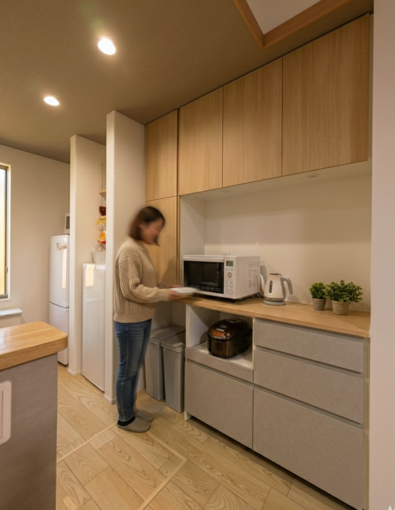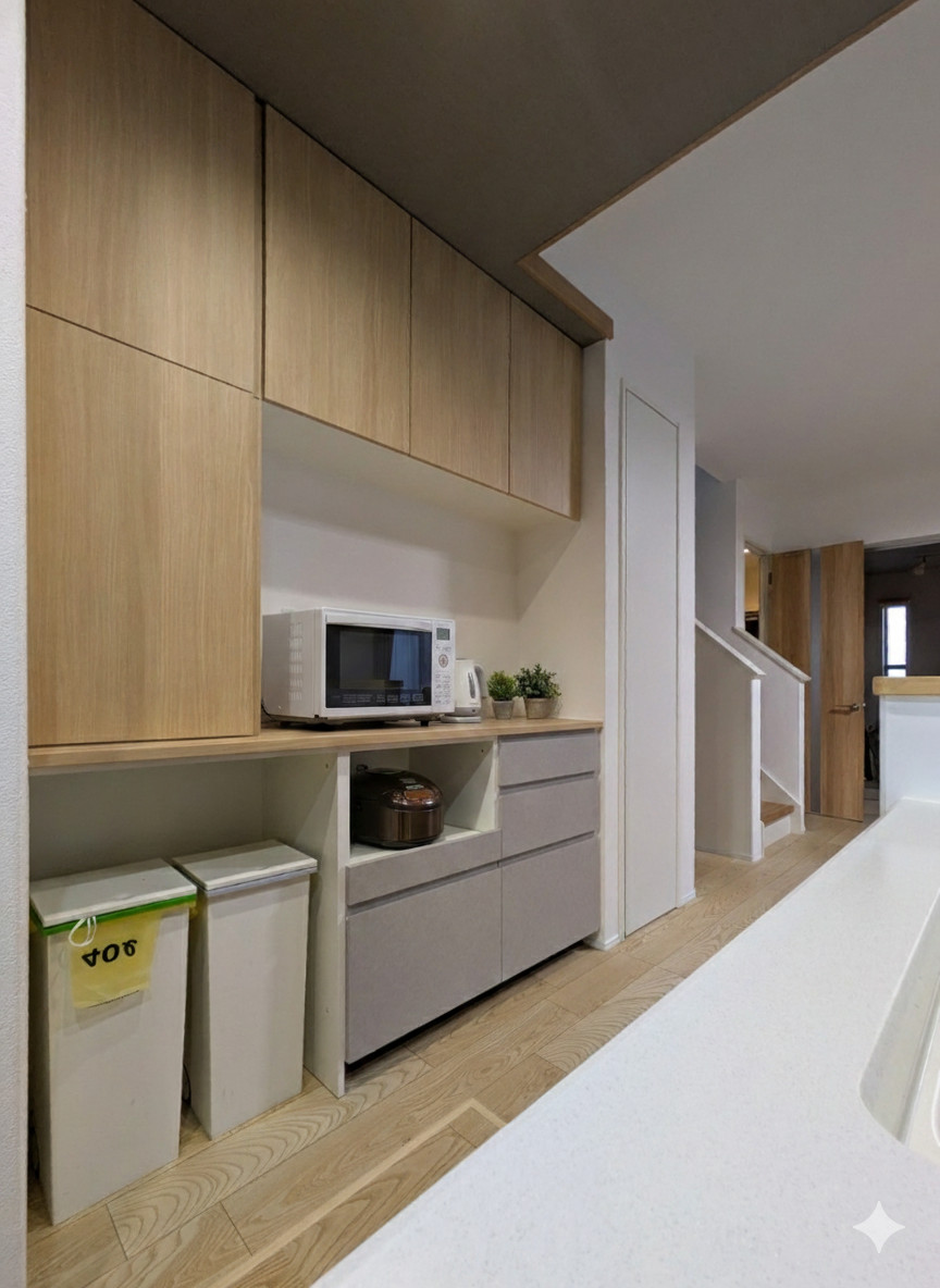 | 関連事例 | トール収納付きカップボードの別事例(戸建て住宅・高さ180cm)はこちら 是非参考にしてください。 |
