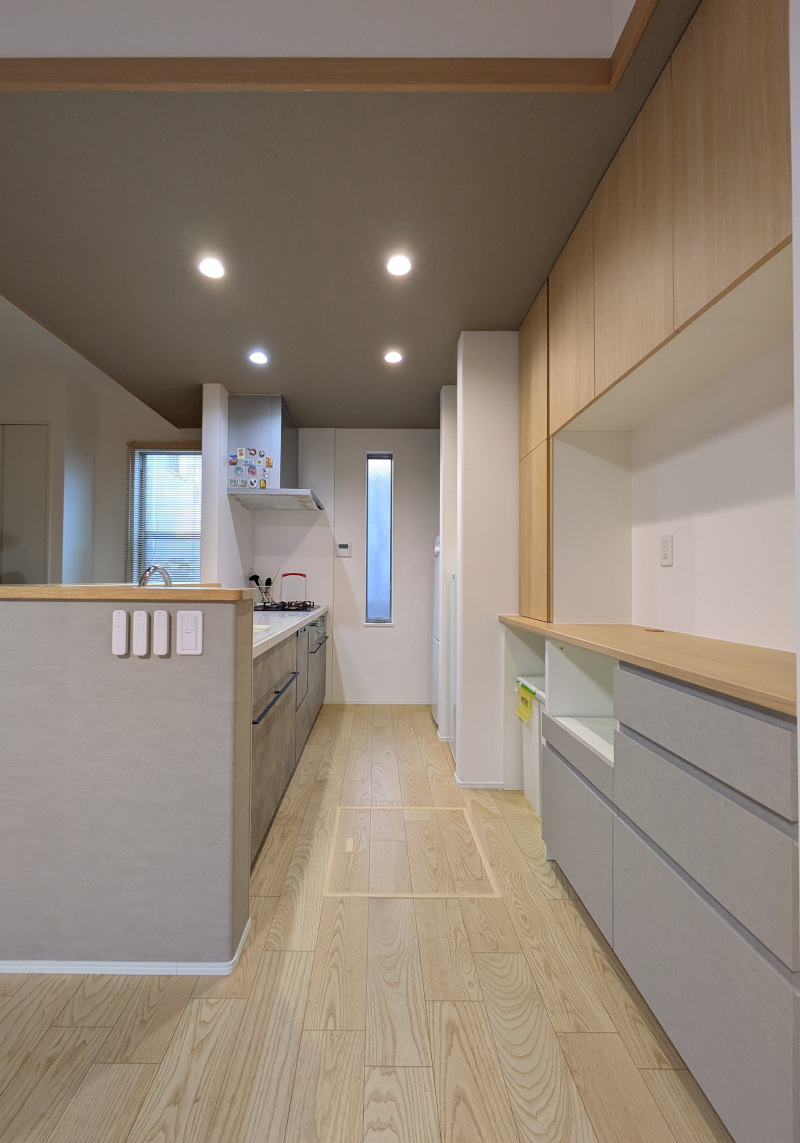 LDKの空間カラーに合わせた、グレー×木目の170cm幅オーダーカップボード