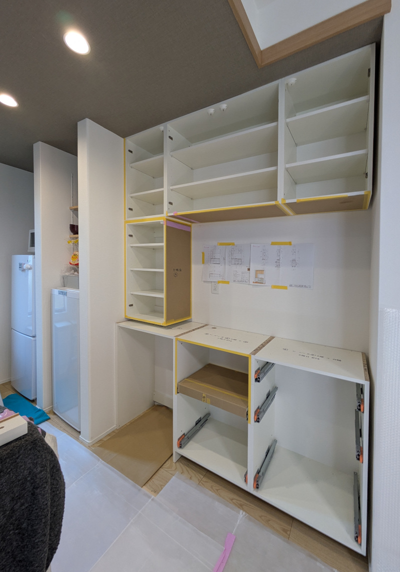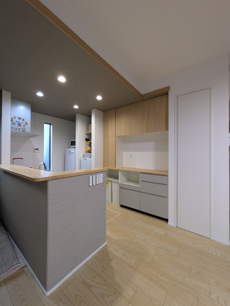新築戸建て住宅のLDKに設置した、170cm幅のオーダーカップボードの設置搬入事例です。 扉カラーはキッチン本体の色に合わせるのではなく、LDK全体の空間カラーを基準にプランニングしています。 キッチン扉の色に縛られず、空間全体との調和を考えて配色を検討できる点は、オーダーならではの特長です。